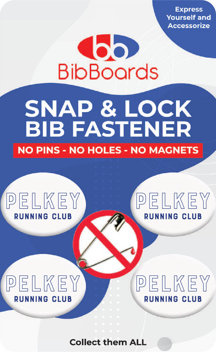 Officially branded Pelkey Running Club BibBoards featuring snap and lock technology to keep your bib secure from fun runs to marathons, and everything in between. No more safety pins, no more holes in your clothes!